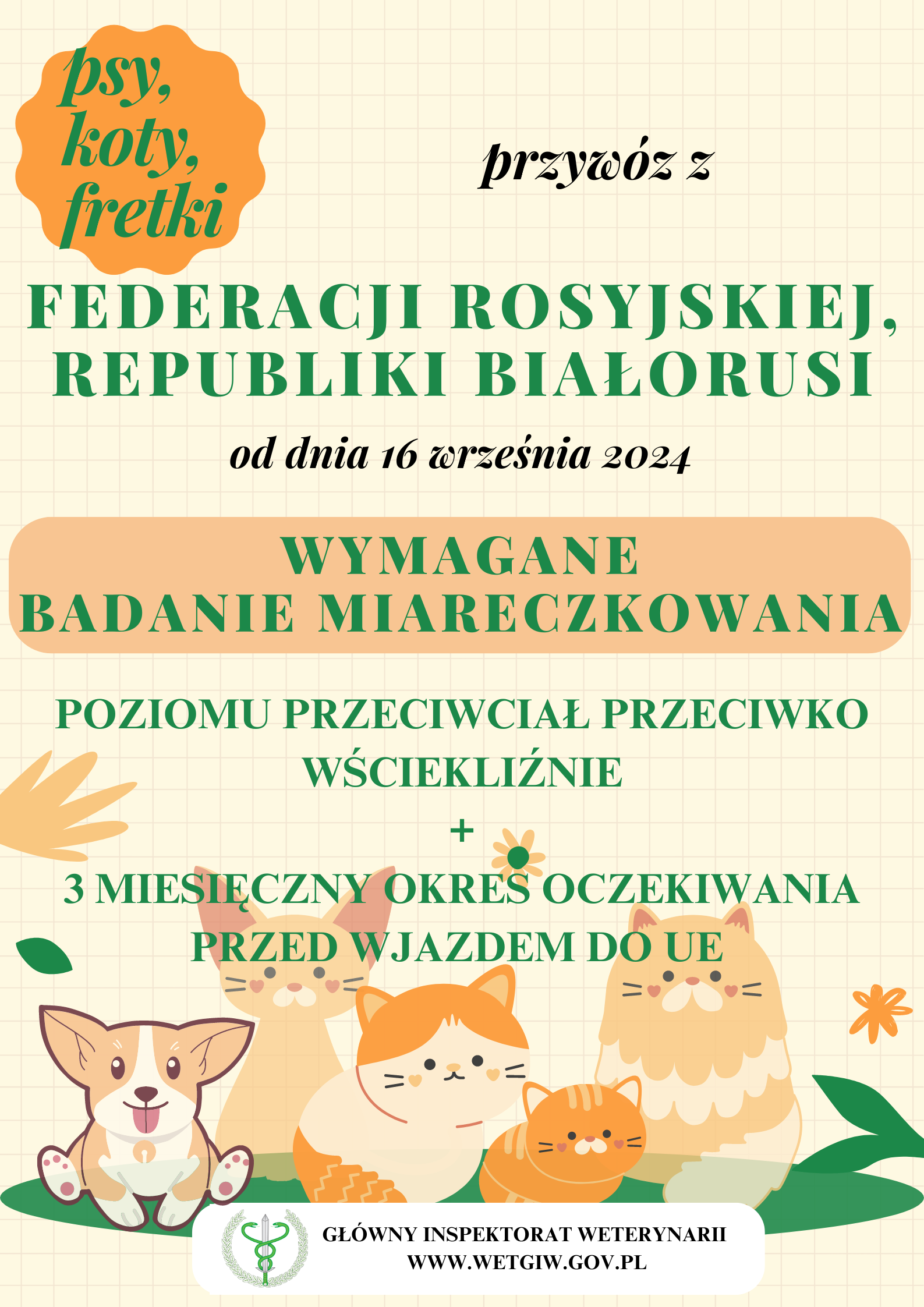 Powiatowy Lekarz Weterynarii w Gorzowie Wlkp. informuje, że od 16 września 2024 r. zmianie ulegną zasady przemieszczania psów, kotów, fretek z Federacji Rosyjskiej oraz Republiki Białorusi na terytorium Unii Europejskiej. Zmiany te dotyczą zarówno przemieszczania w celach niehandlowych jak i handlowych. Zgodnie z przyjętymi przez Komisję Europejską rozporządzeniami, które stosuje się od 16 września 2024 r. Federacja Rosyjska i Republika Białorusi zostały skreślone z listy państw zwolnionych z obowiązku badania miareczkowania poziomu przeciwciał przeciwko wściekliźnie. Poniżej umieszczone zostały plakate informacyjne: